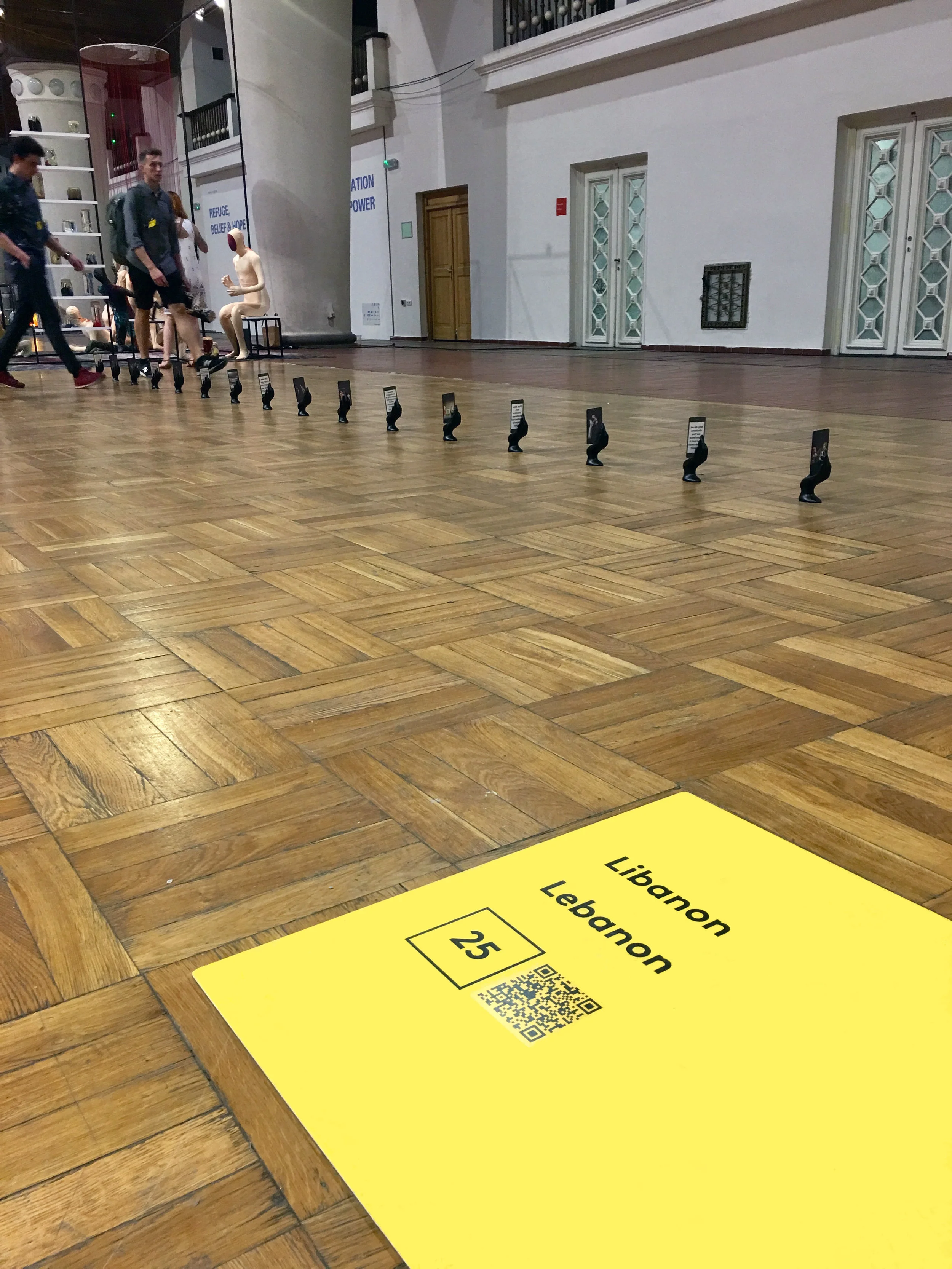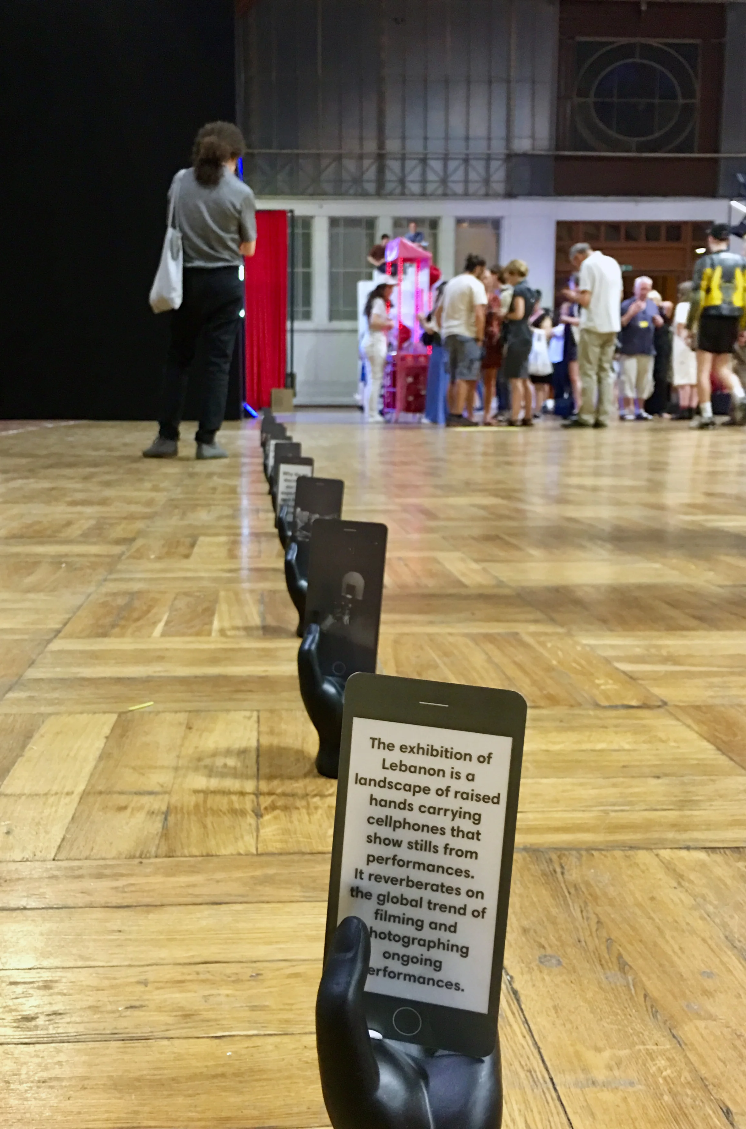 The exhibition of Lebanon is an exhibition landscape of raised hands carrying cellphones showing stills from performances. It reverberates on the global trend of audience members filming and photographing ongoing performances.