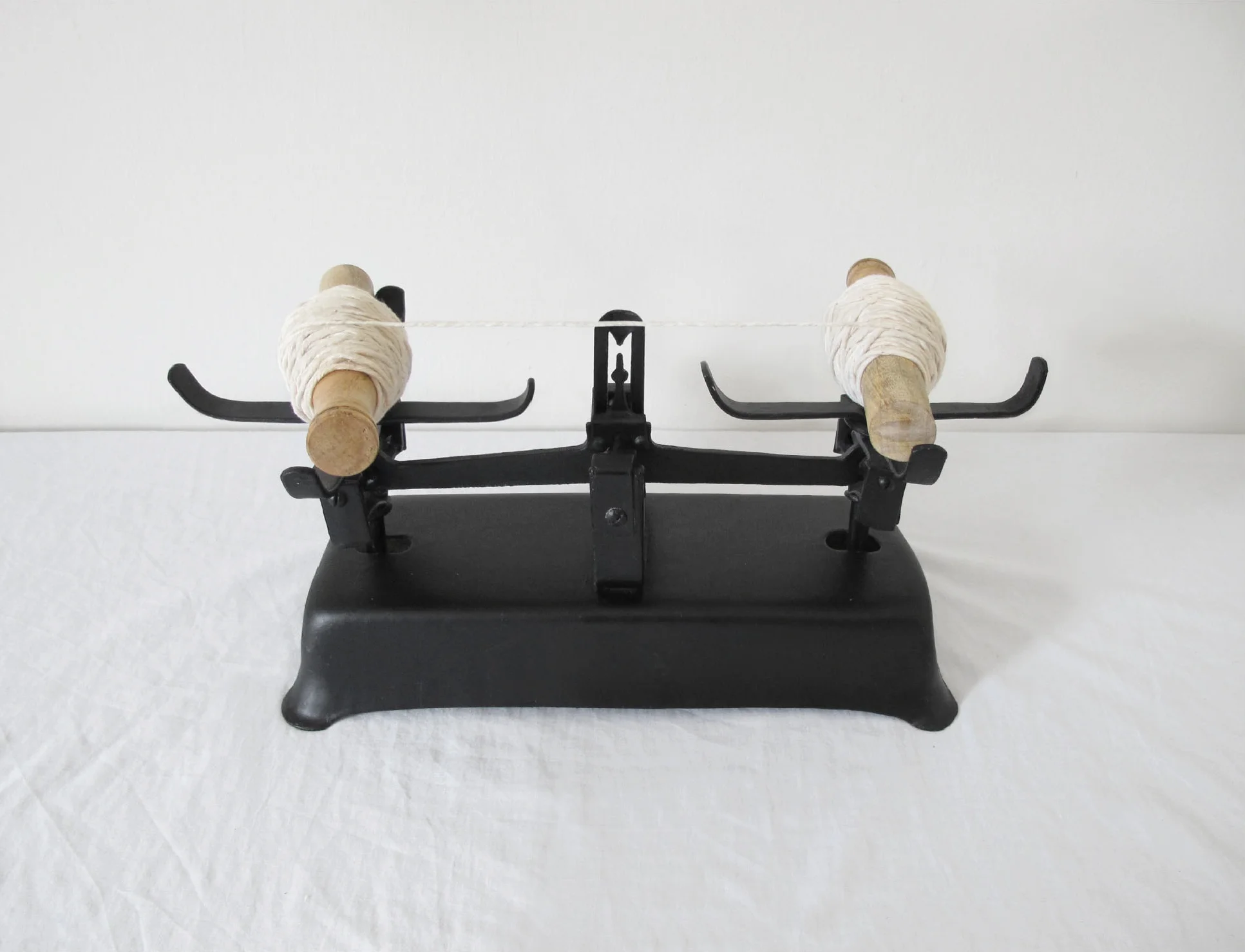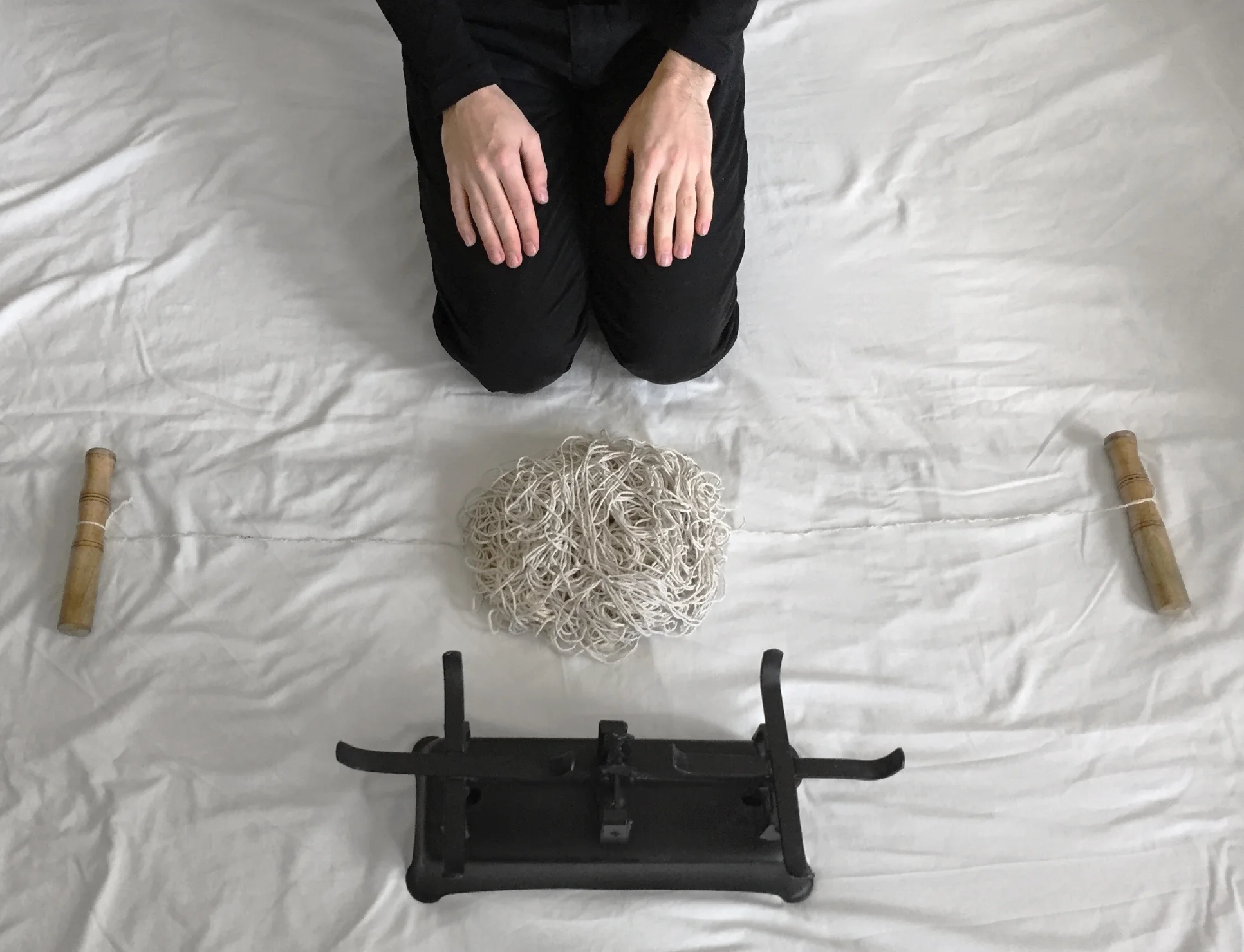 The result of this performance will be two connected ravels, each one rolled on a wooden cylinder, resting equally on each side of the scale.